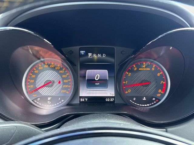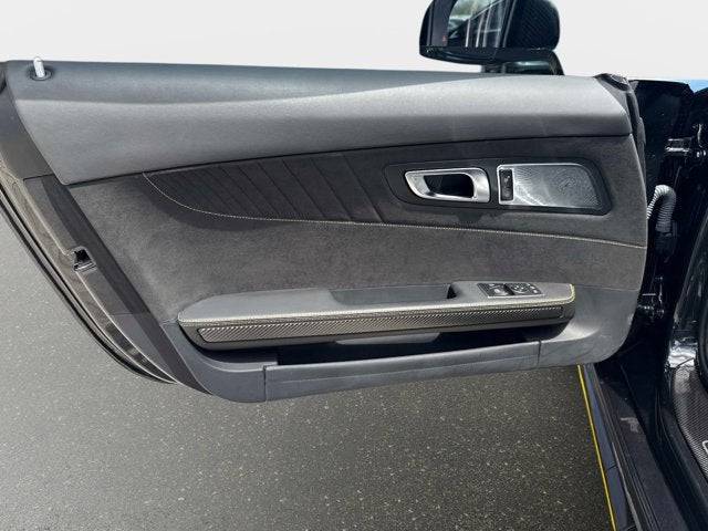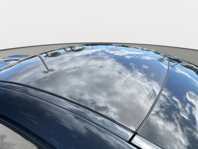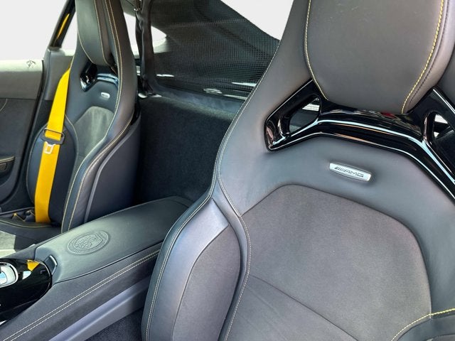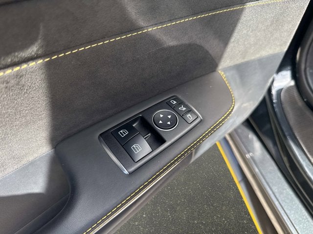 The car is finished in Magnetite Black Metallic with a carbon-fiber roof and yellow accents and was optioned with the AMG Exterior Carbon Fiber packages I and II, which added gloss black window trim in addition to a carbon-fiber front splitter, rear wing, rear diffuser, side vent fins, mirror caps, and side sill inserts. Additional features include carbon-fiber fenders, Parktronic, and LED headlights and taillights. Xpel clear paint protection film was applied to the nose in August 2021, and a rear bumper trim piece was replaced that same month.